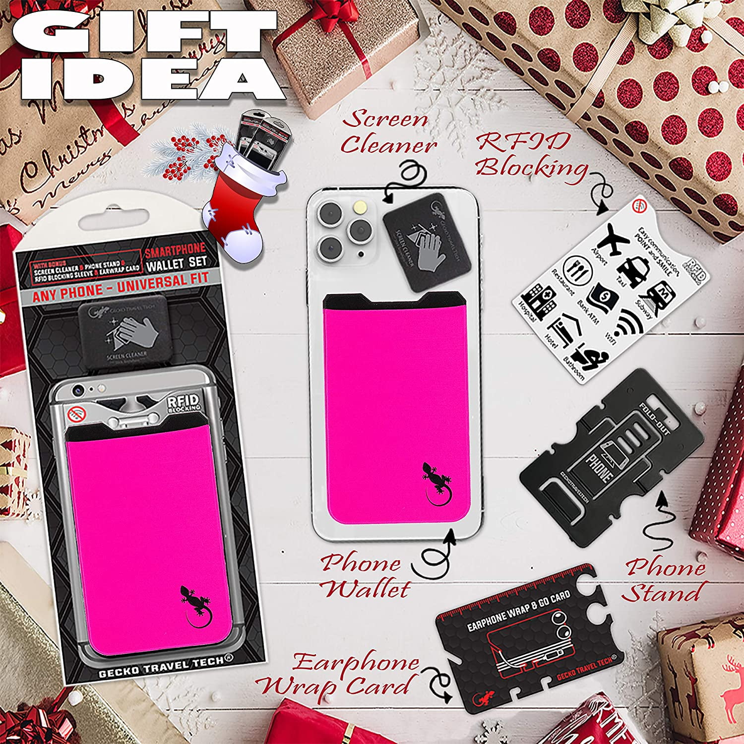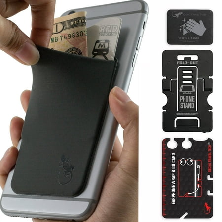 Web Gecko Adhesive Phone Wallet RFID Blocking Sleeve a Stick-On Stretchy Lycra Card holder Universally fits most Cell Phones Cases. It has a PU Gel adhesive backing that lets it stick to virtually any phone model or phone case model that. Web Gecko Travel Tech.
